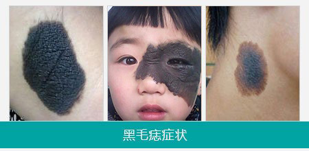 黑毛痣常生长在脸部、额头、颈部、胸部、下肢等全身各部位,且以长在头面部、颈部和胸部为难看。痣细胞巢位于表皮和真皮,隆起皮肤或呈乳头状,局部发黑,表面粗糙不平,有的上面只有很少毛发,有的却很浓密,比一般的毛发粗黑。
